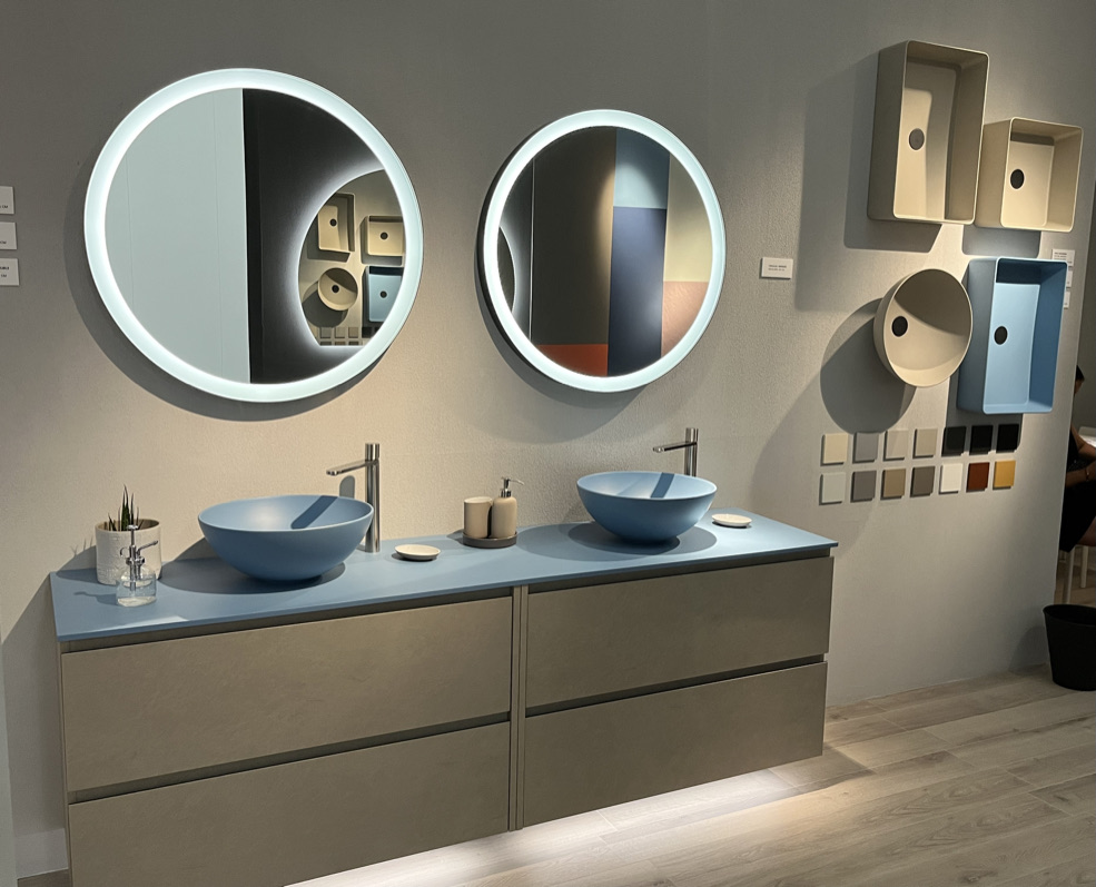 L’espace dans lequel nous avons exposé la nouvelle gamme de vasques à poser a attiré l’attention pour sa couleur, un bleu RAL 5024 qui a fait l’objet d’éloges et de compliments. Le meuble de salle de bain et les miroirs ont également attiré l’attention de cet espace, deux nouveautés pour notre prochain catalogue qui, comme tous nos produits, sont personnalisables en dimensions et finitions, toujours avec la qualité maximale qui nous caractérise.