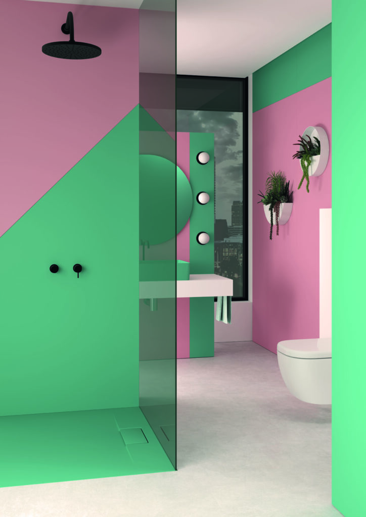 Dans cet exemple, nous montrons les panneaux Space réalisés sur mesure en finition Lisse et RAL 6034 et RAL 3015, combinés avec le receveur de douche Radiance, également en finition lisse et RAL 6034. Un concept de style créatif et pop pour les goûts les plus alternatifs qui s’étend dans toute la salle, où l’on peut apprécier plusieurs panneaux Space, ainsi qu’un lavabo Emotion en RAL 6034 et un plan vasque Energy avec une jupe en finition lisse et de couleur blanc pur, qui combine avec l’habillage Deco WC Tulip.