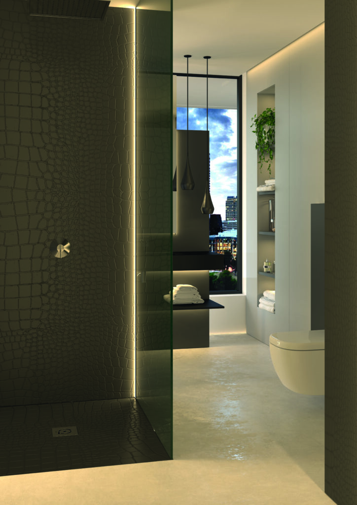 Le panneau Space en texture Crocodile et couleur Anthracite, assorti au receveur de douche Relief Plus avec même couleur et texture. Une touche originale et sophistiquée pour une salle de bain exclusive.